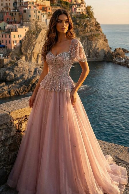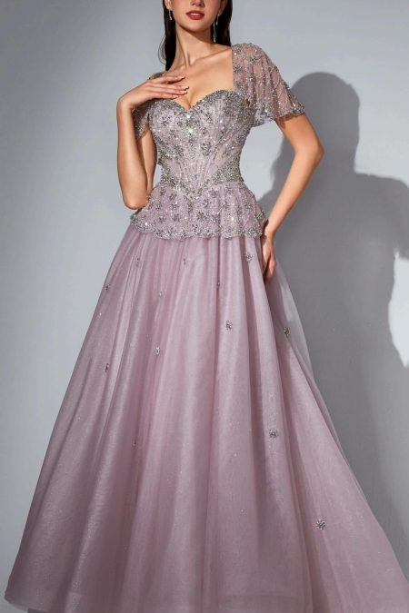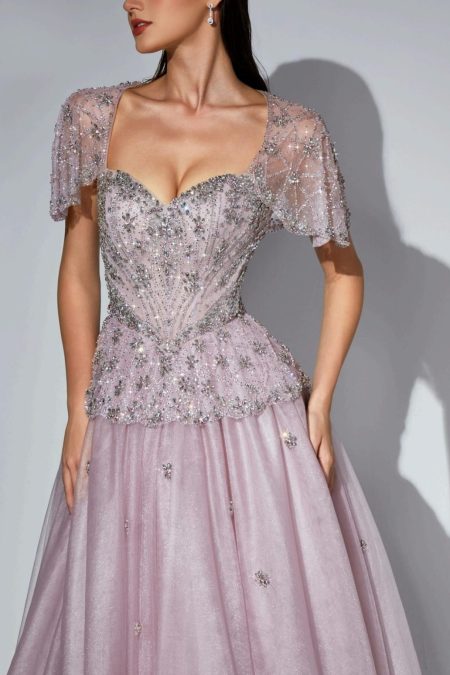 فستان كلوش مشغول بنصف اكمام مفتوحة مشغولة بالكرستال والاحجار ناعم
