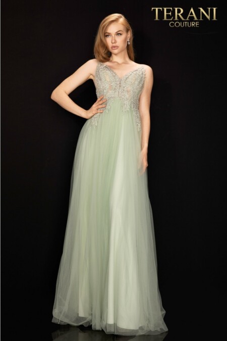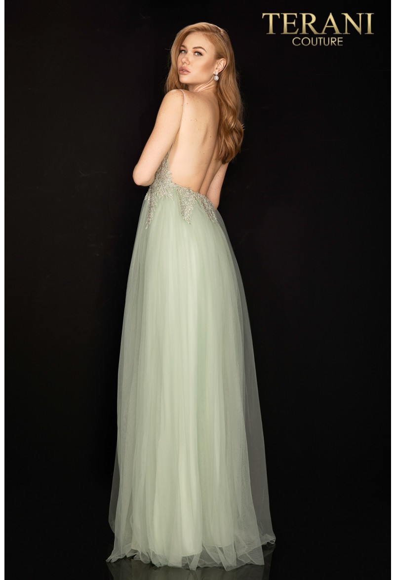 فستان سهرة ماكسي بحمالات رفيعة وتطريز رقيق مزخرف بالورق مع زخرفة من اللؤلؤ على الجزء العلوي من الفستان مع ستايل تنورة من التول الناعم وظهر مكشوف من تصميم تيراني كوتور