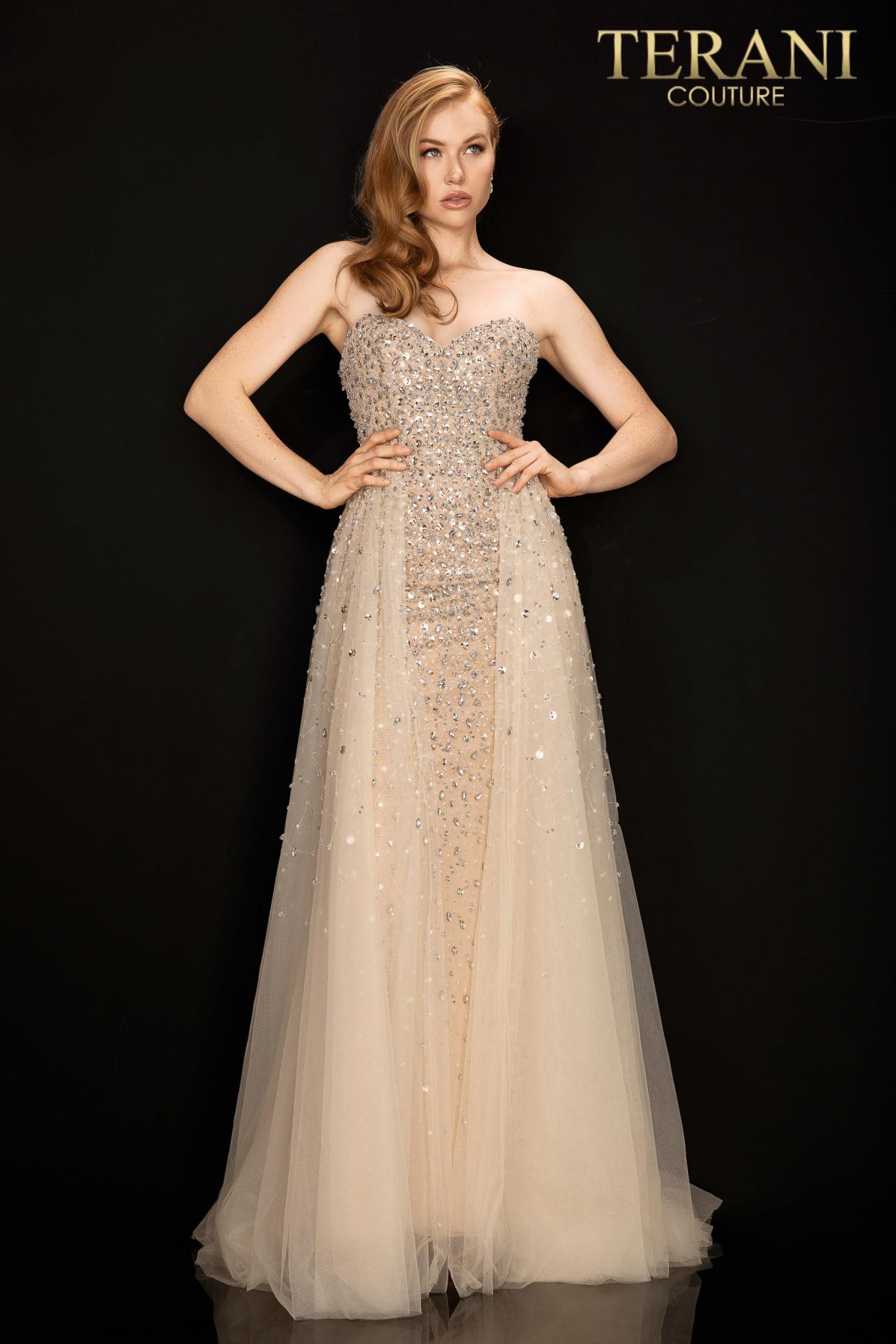 اطلالة راقية أخرى من تصميم تيراني كوتور عاري الكتفين بدون حمالات ، مشغول بالكامل بالخرز والترتر الفضي مع ستايل طبقات تنورة من التول المربعة الشفافة