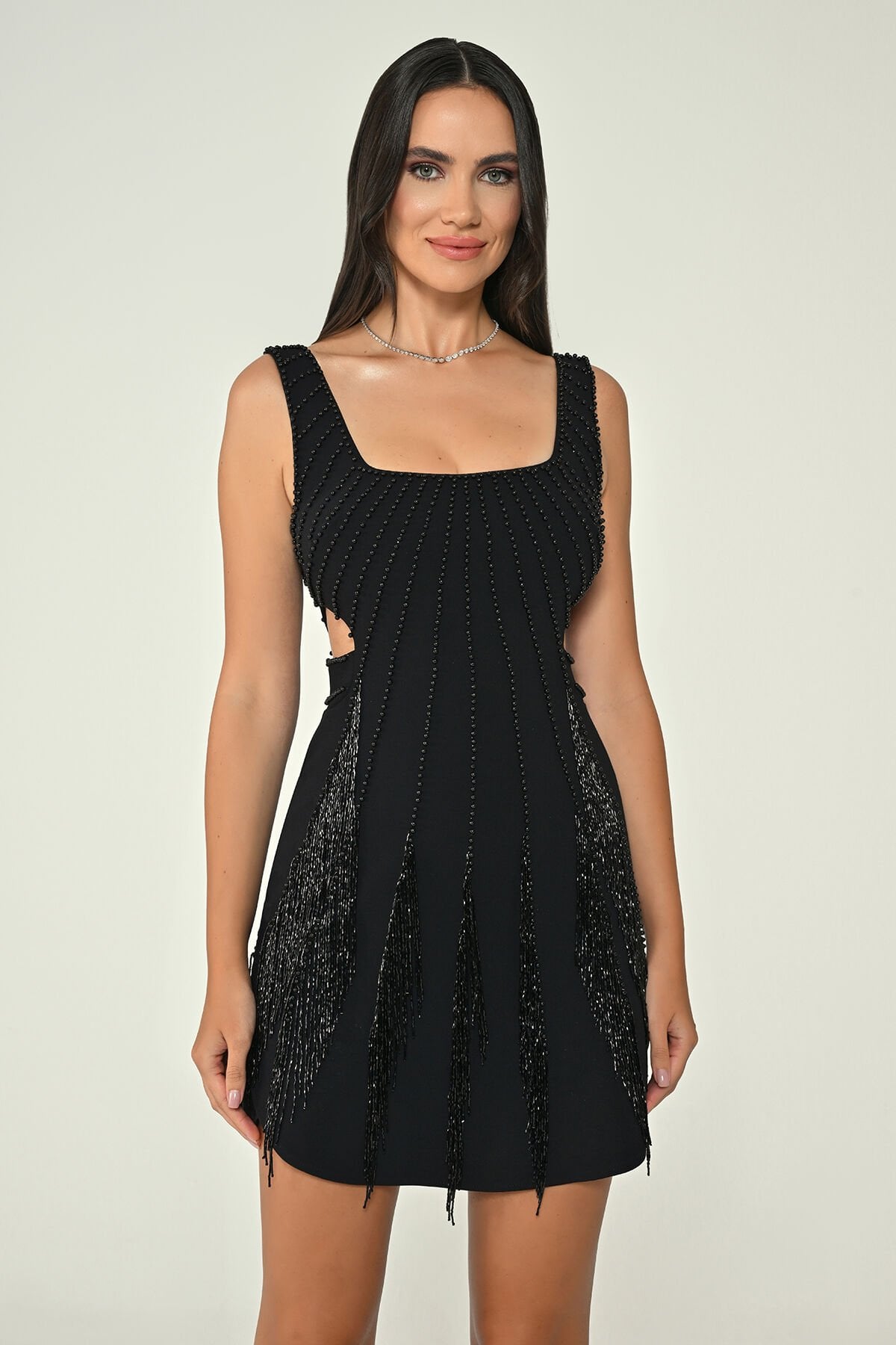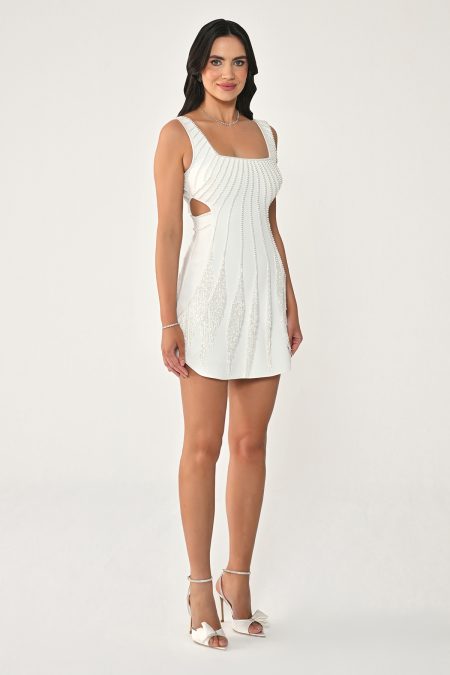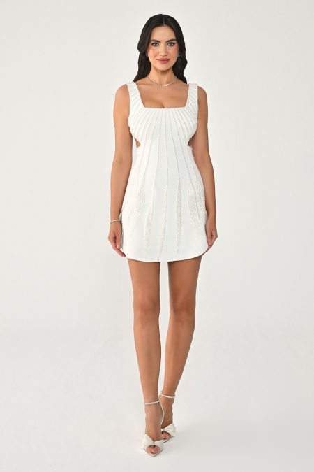 فستان باللون الابيض والاسود مشغول قصير بدون اكمام