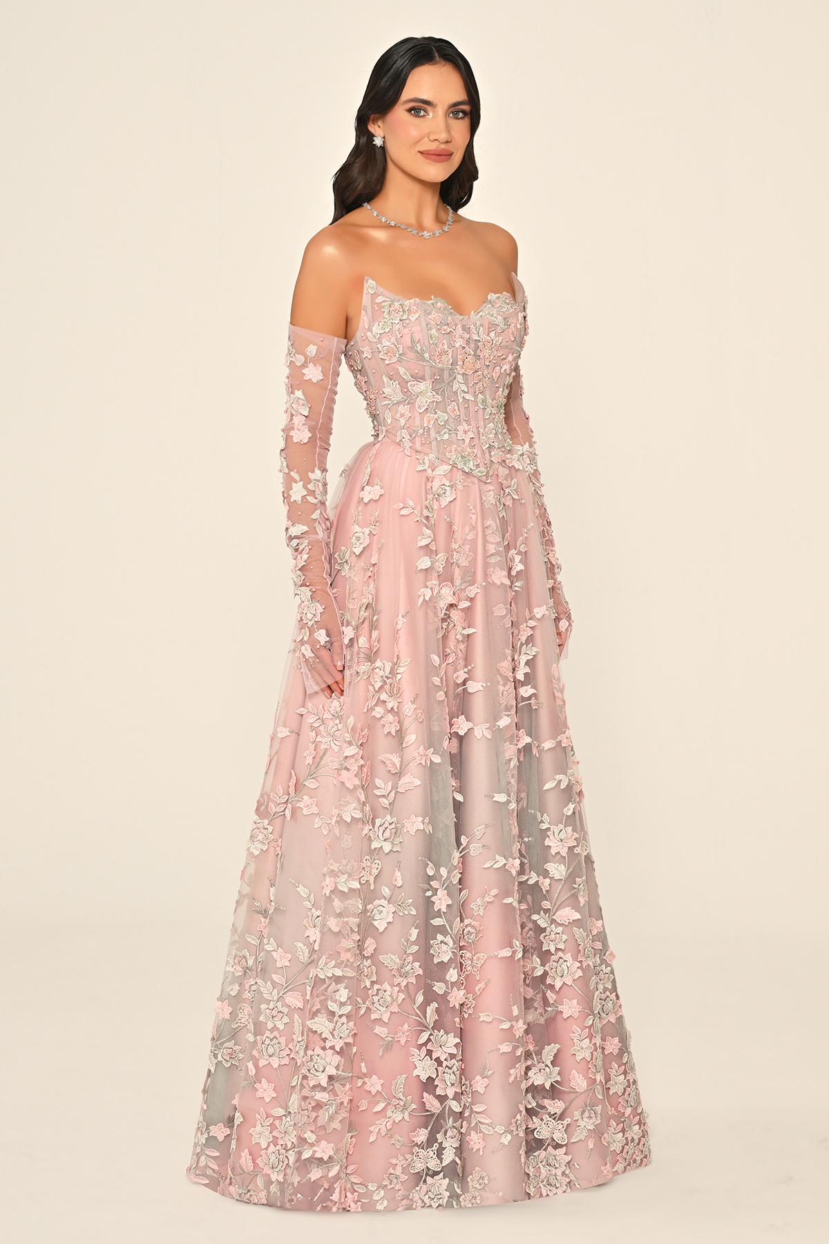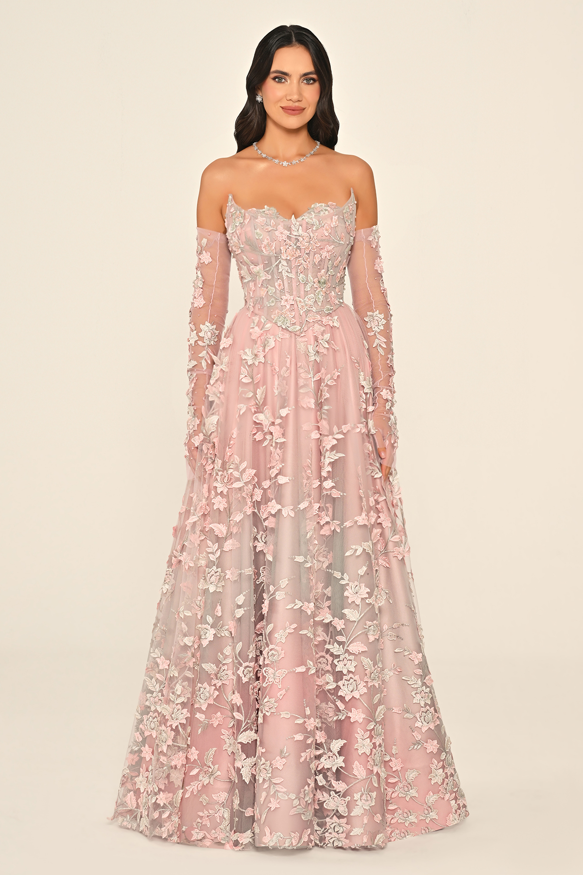 فستان فاخر من الفا بيتا مشغول بشكل كامل كلوش باكمام منفصلة وقصة صدر توب رائعة