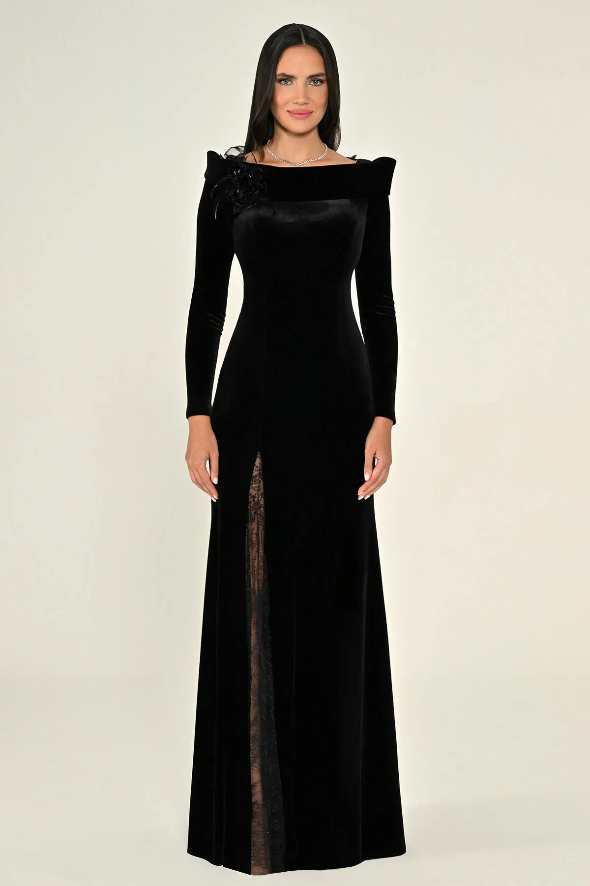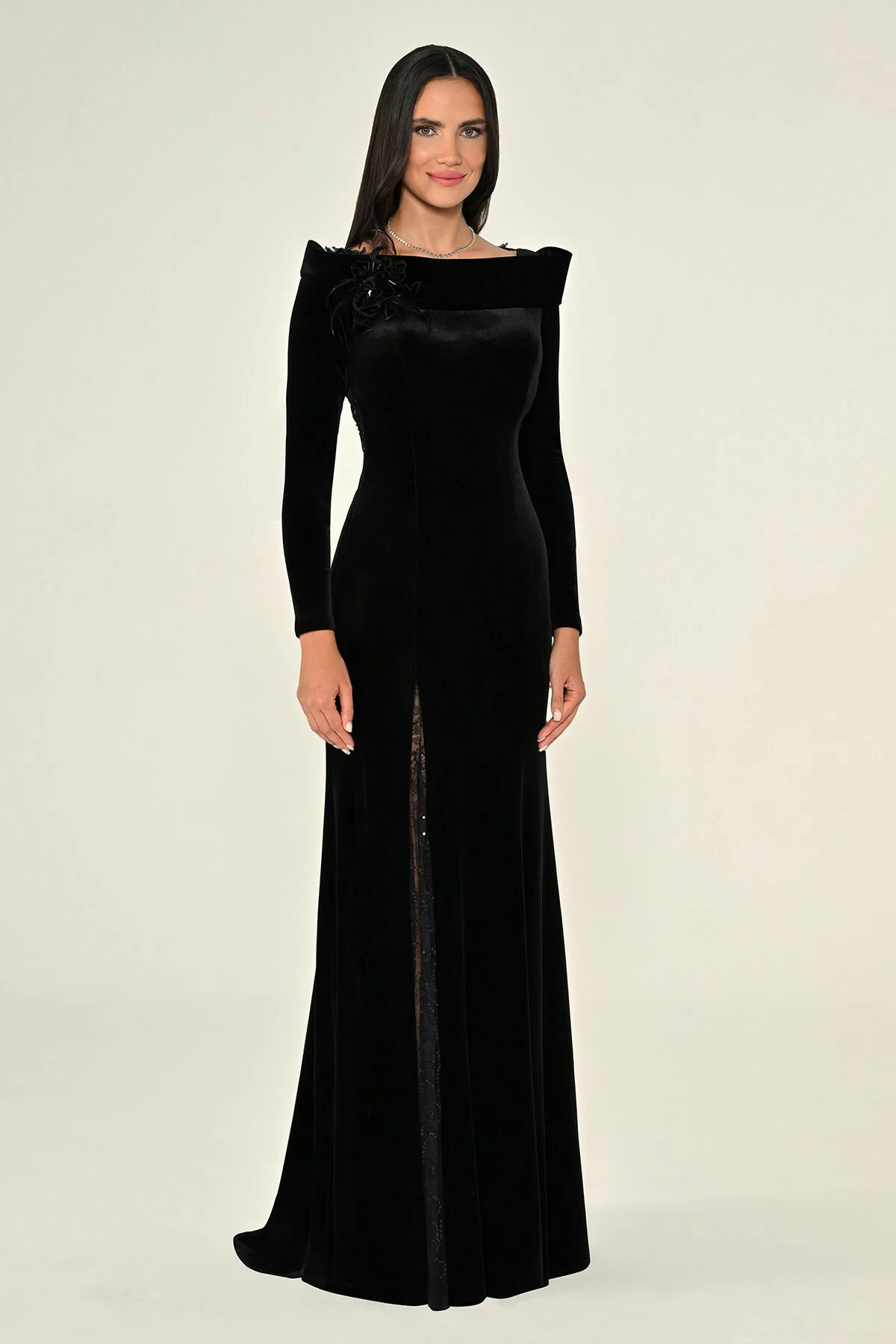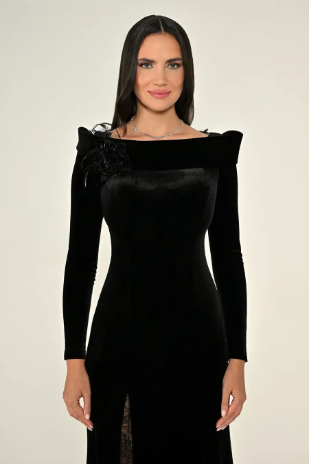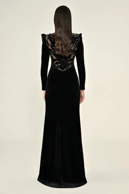 فستان مخمل باكمام طويلة مشغول من الخلف والاكتاف بفتحة ساق