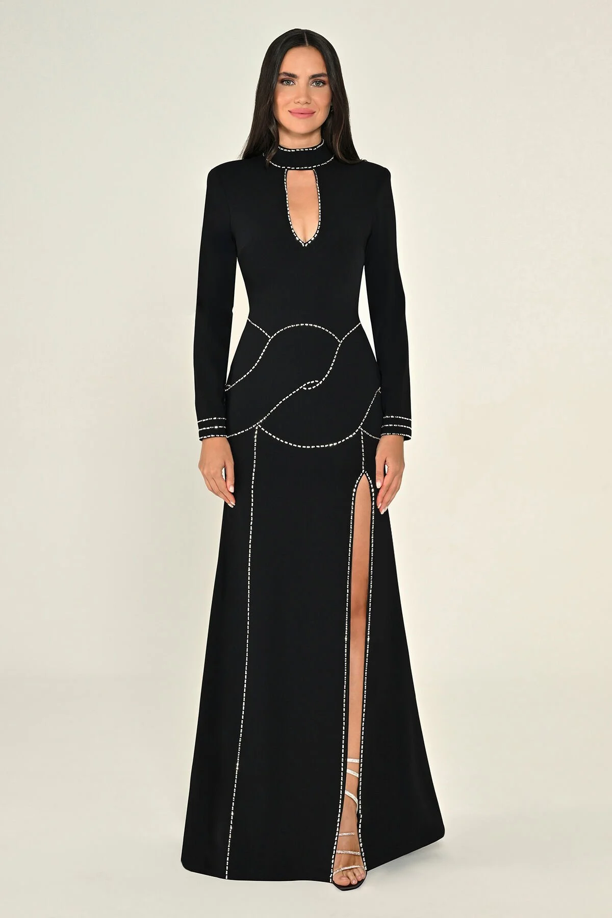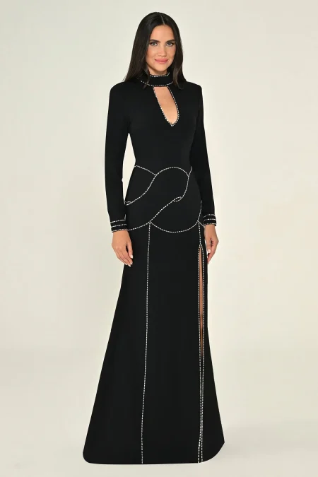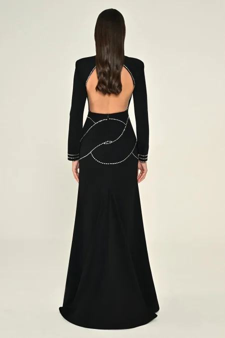 فستان الفا بيتا باكمام طويلة مطرز بفتحة ضهر من الكولكشن الجديد مصنوع من الكريب