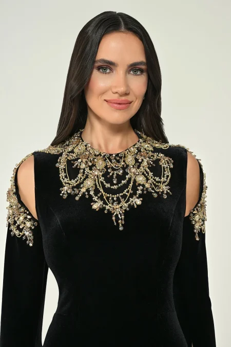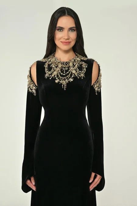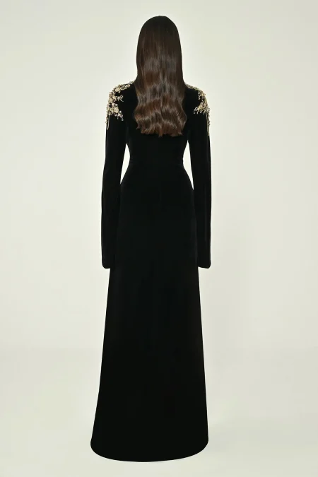 فستان من المخمل مشغول باكمام طويلة وفتحات من عند الكتلف