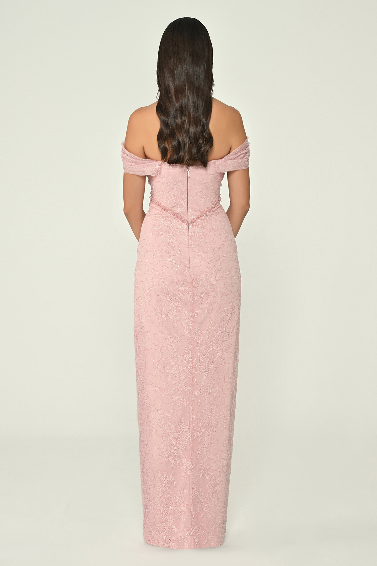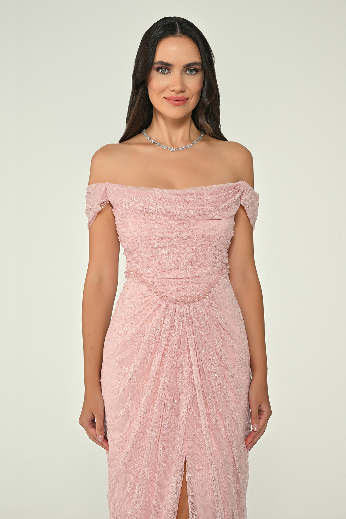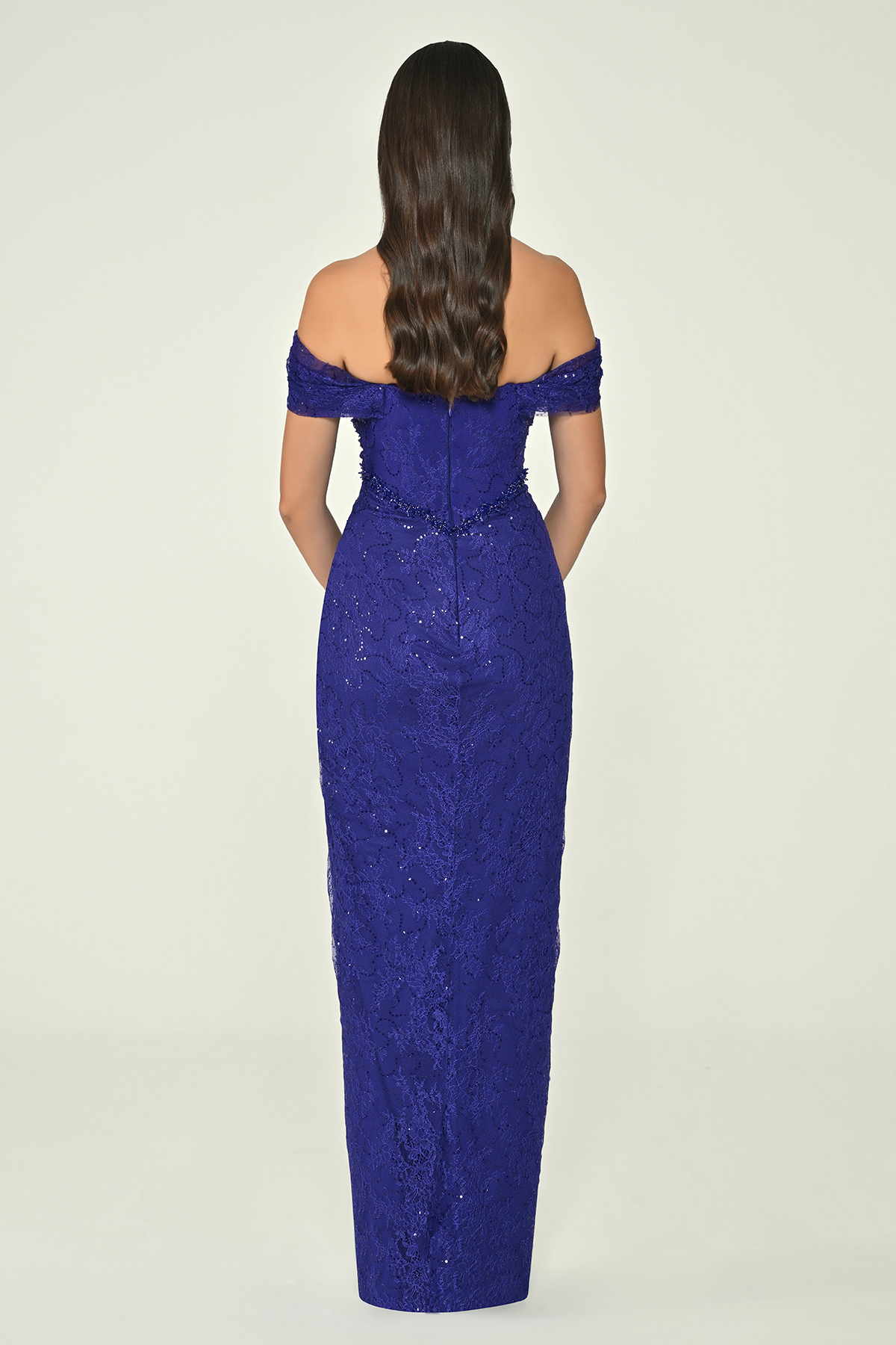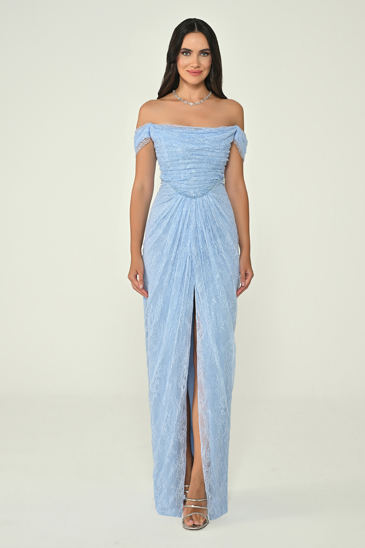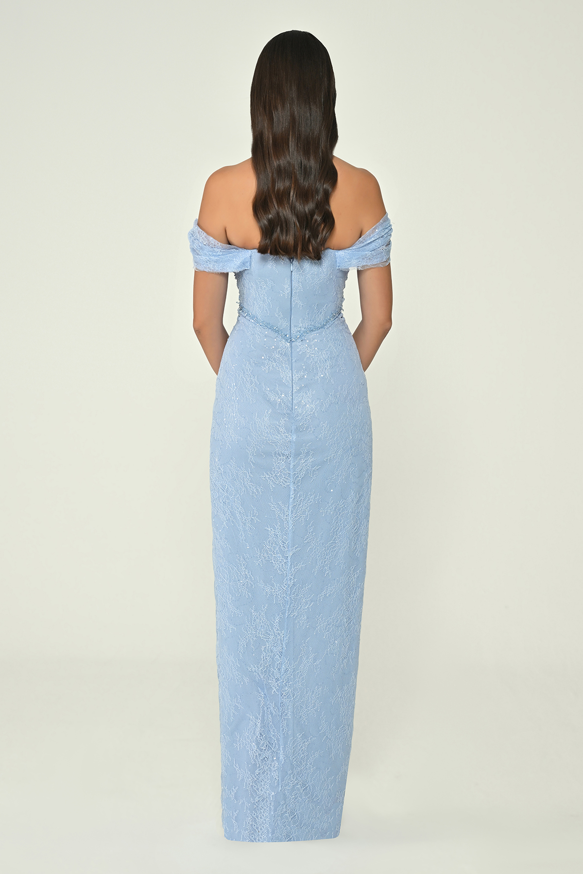 فستان من الدانتيل بعدة الوان بقصة اوف شولدر وفتحة ساق من الامام