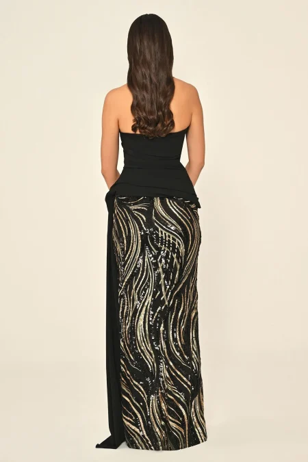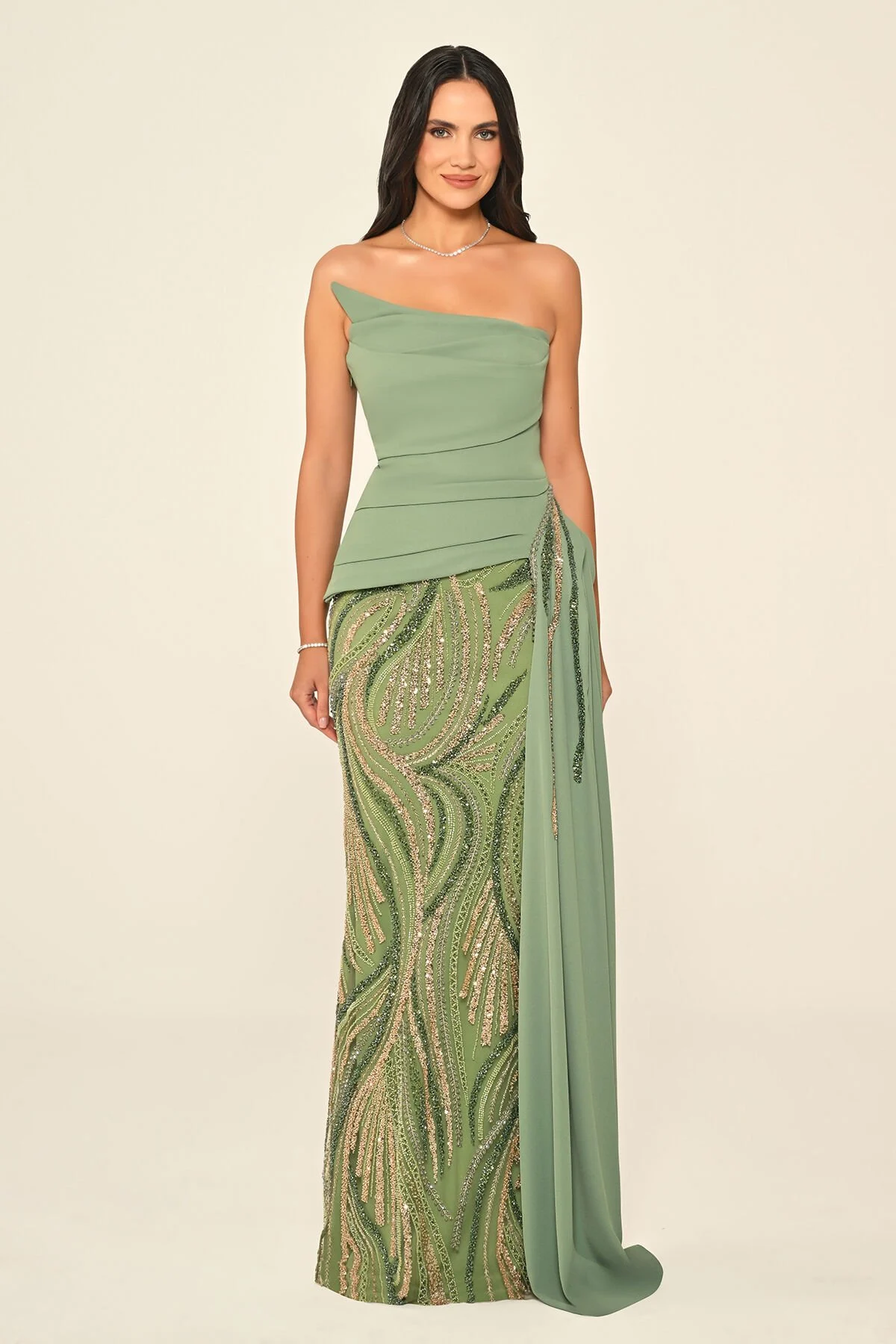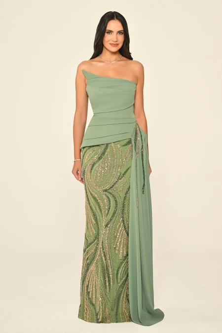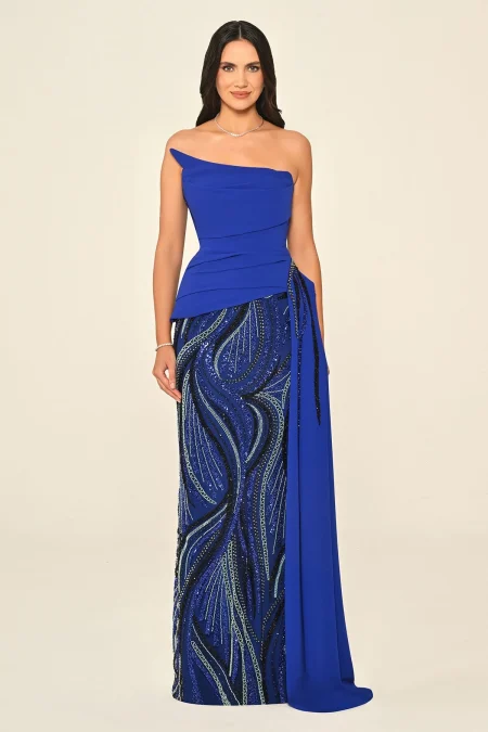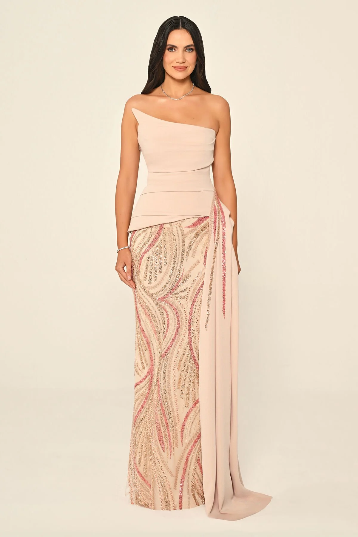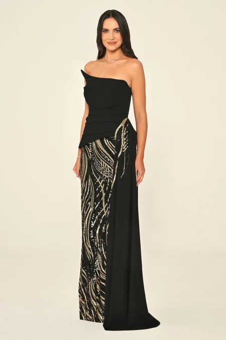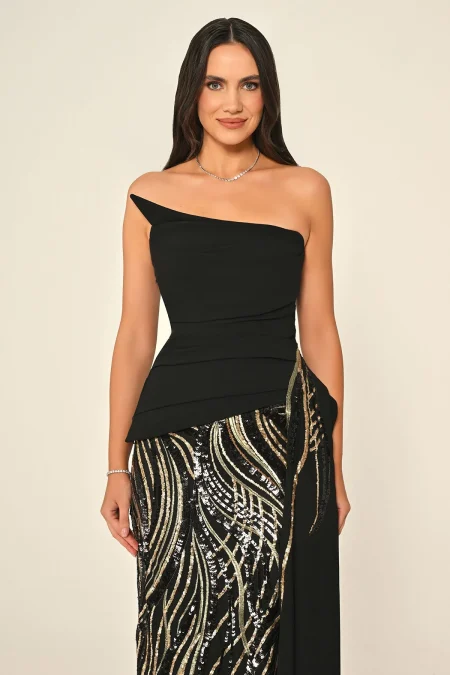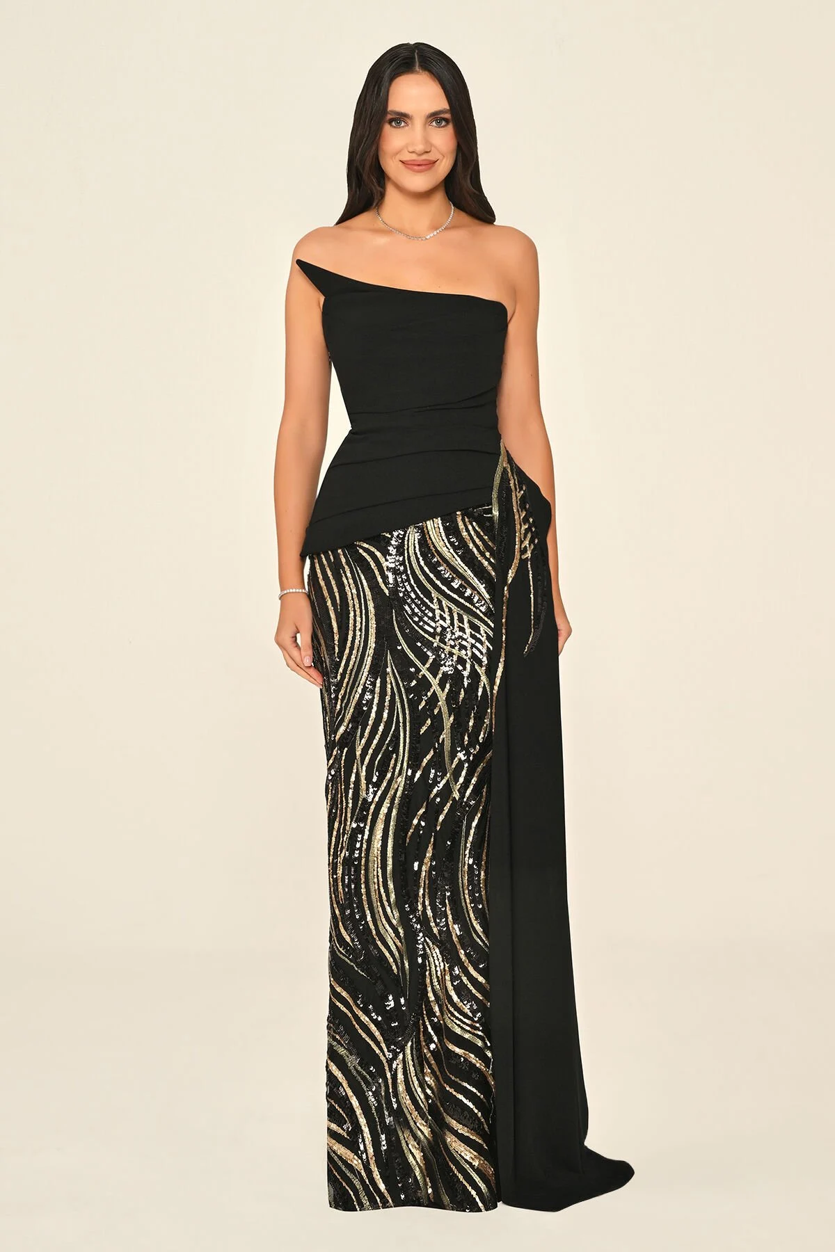 فستان طويل من الكريب بدون حمالات، تنورة غير متماثلة، مزين بالترتر