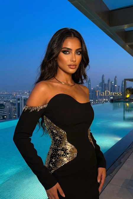 فستان اسود مشغول من الجوانب واطراف الاكمام باللون الذهبي باكمام اوف شولدر مصنوع من الكريب مخصر