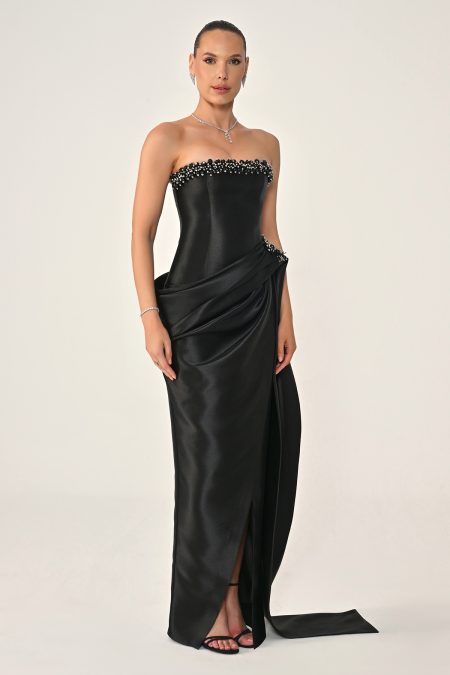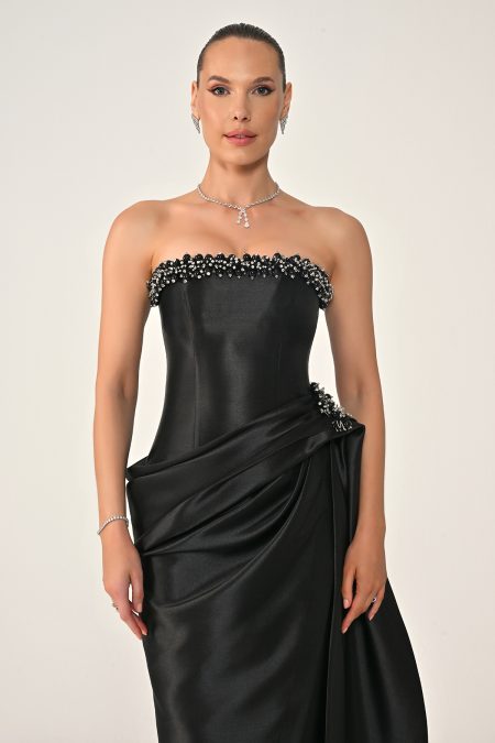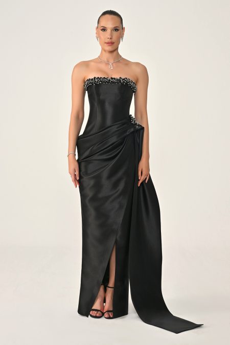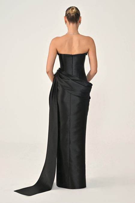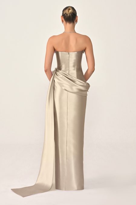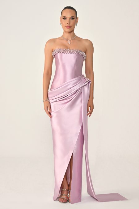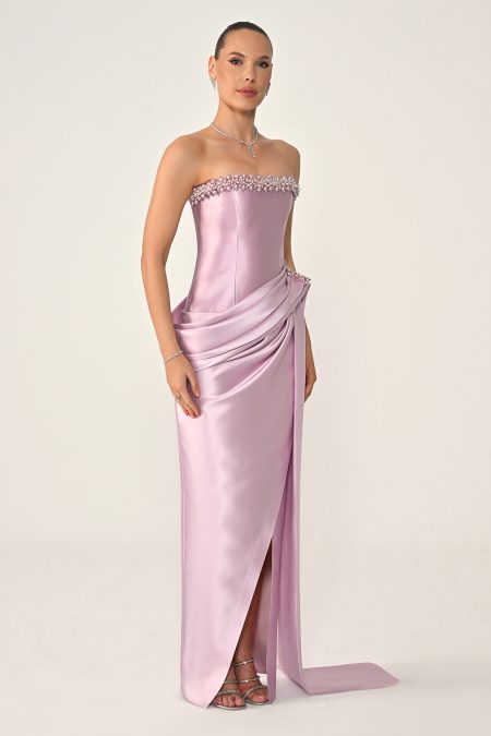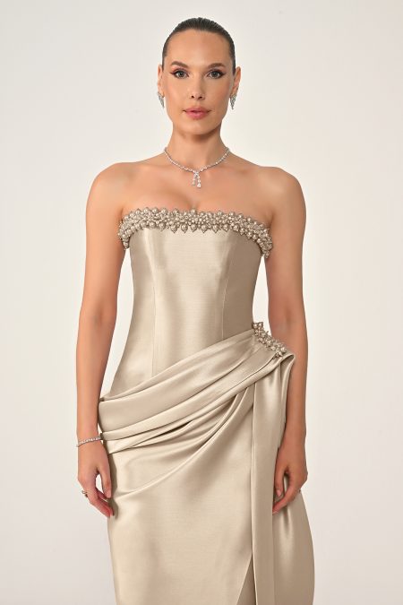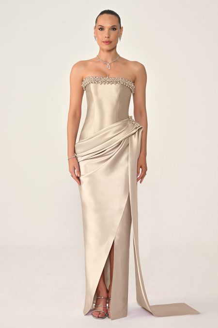 فستان سهرة فاخر بقصّة كورسيه بدون أكتاف، مزين بتطريز كريستالي أنيق مع تفاصيل درابية عند الخصر وقصّة طويلة انسيابية تبرز القوام بأسلوب راقٍ وجذاب.