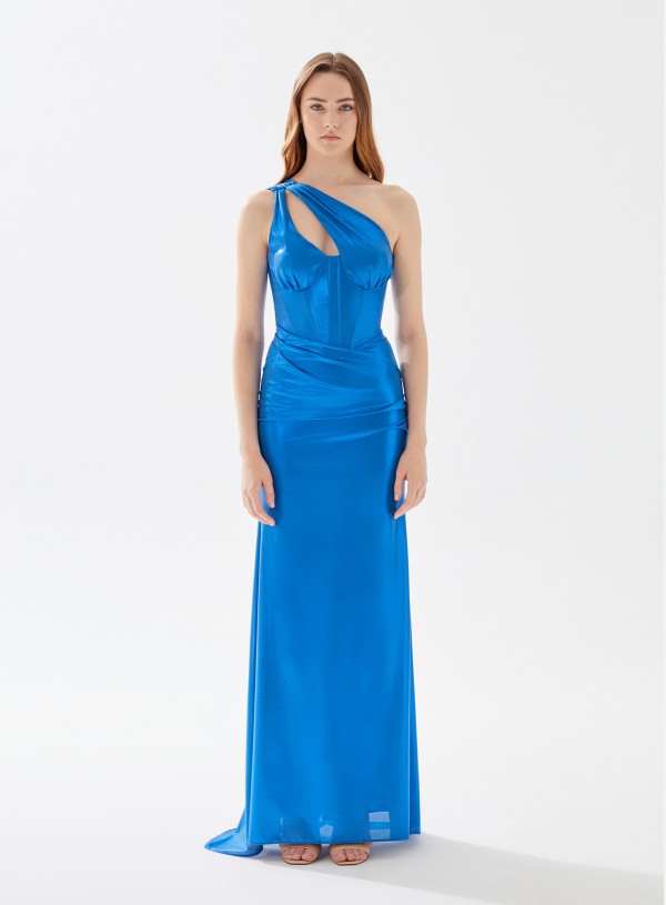 فستان ستان طويل كتف واحد يعرض بشكل حصري علي تيا دريس من فساتين طارق ايديز 2023