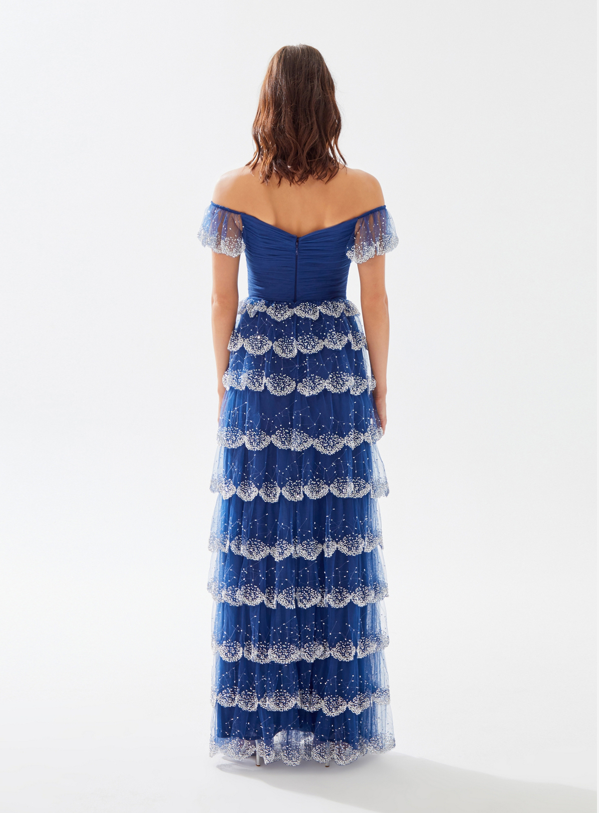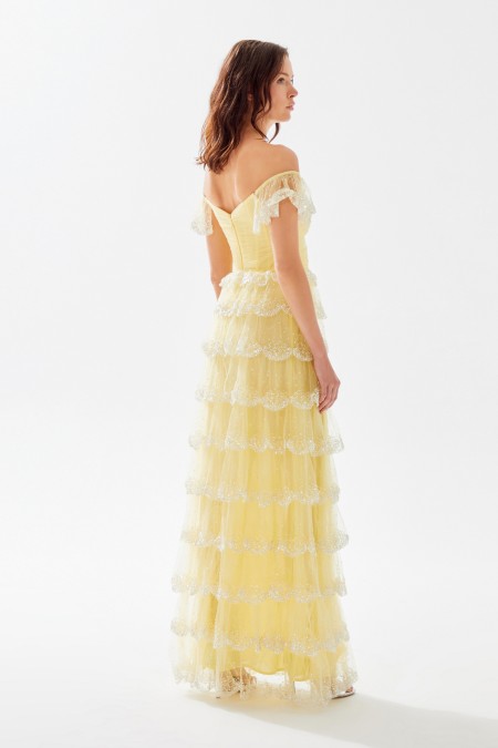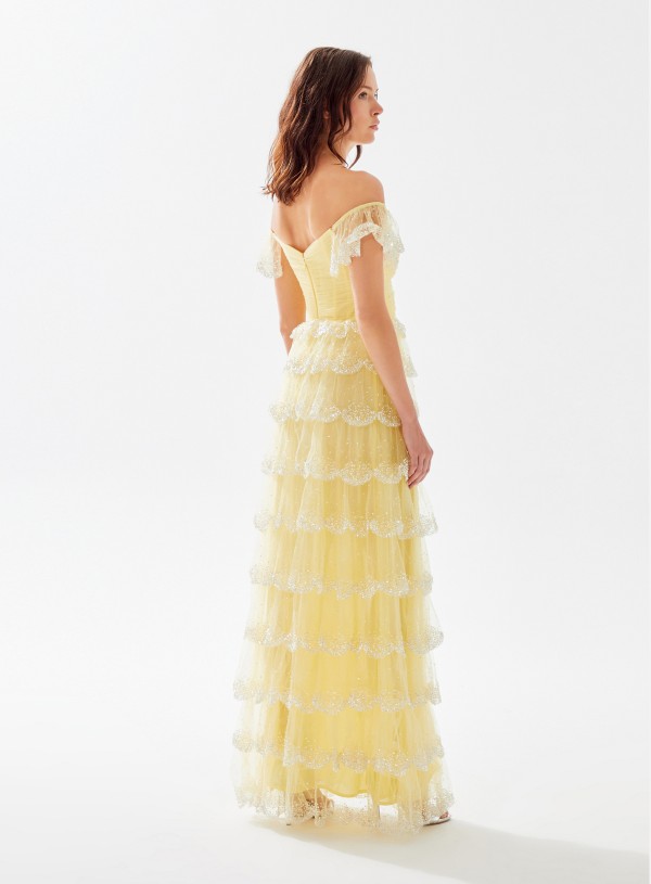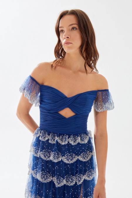 فستان طويل من التول مكشوف الأكتاف يعرض بشكل حصري علي تيا دريس من فساتين طارق ايديز 2023