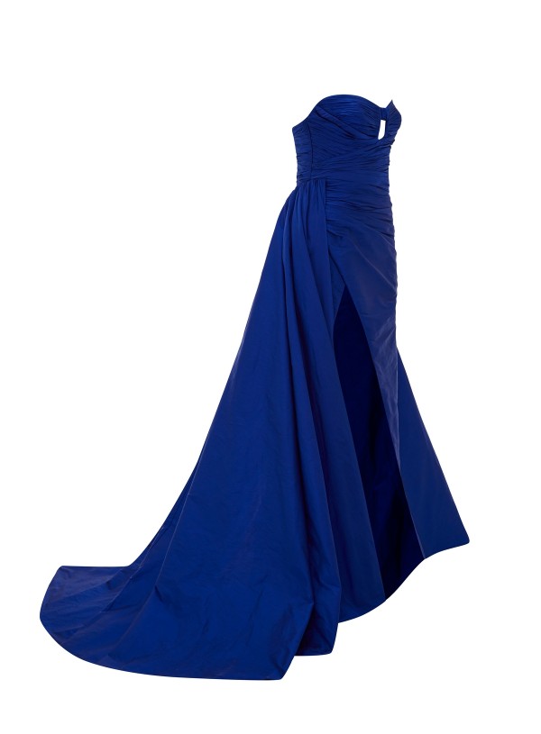 فستان طويل بياقة على شكل قلب بدون حمالات وفتحة أمامية وفتحة تصل إلى الفخذين يعرض بشكل حصري علي تيا دريس من فساتين طارق ايديز 2023
