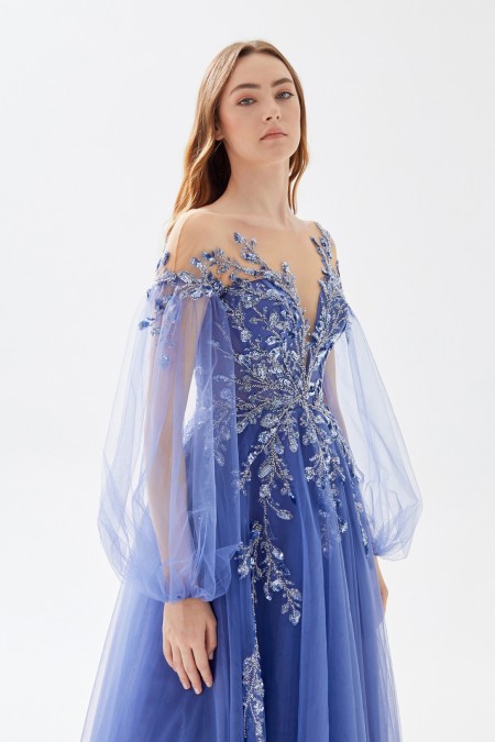 فستان شفاف بياقة من التول و بأكمام منتفخة يعرض بشكل حصري علي تيا دريس من فساتين طارق ايديز 2023