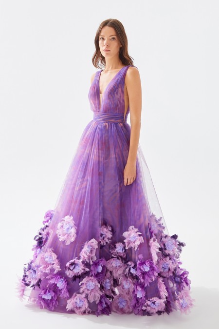 فستان من التول متعدد الألوان مع تفاصيل زهور من الريش يعرض بشكل حصري علي تيا دريس من فساتين طارق ايديز 2023