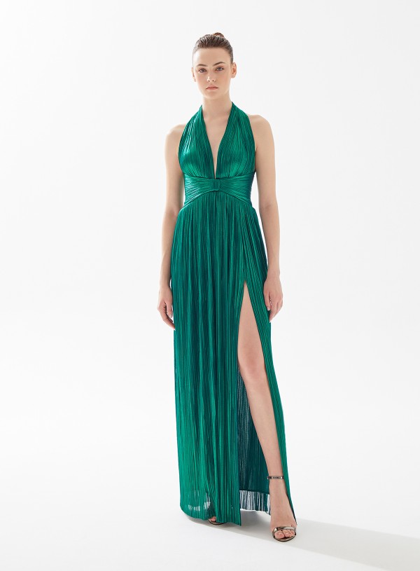 فستان طويل بفتحة ساق جانبية بطيات مع تفصيلة حزام يعرض بشكل حصري علي تيا دريس من فساتين طارق ايديز 2023