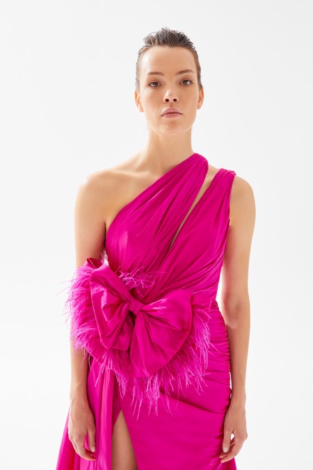 فستان طويل بكتف واحد مع فتحة ساق وفيونكة يعرض بشكل حصري علي تيا دريس من فساتين طارق ايديز 2023