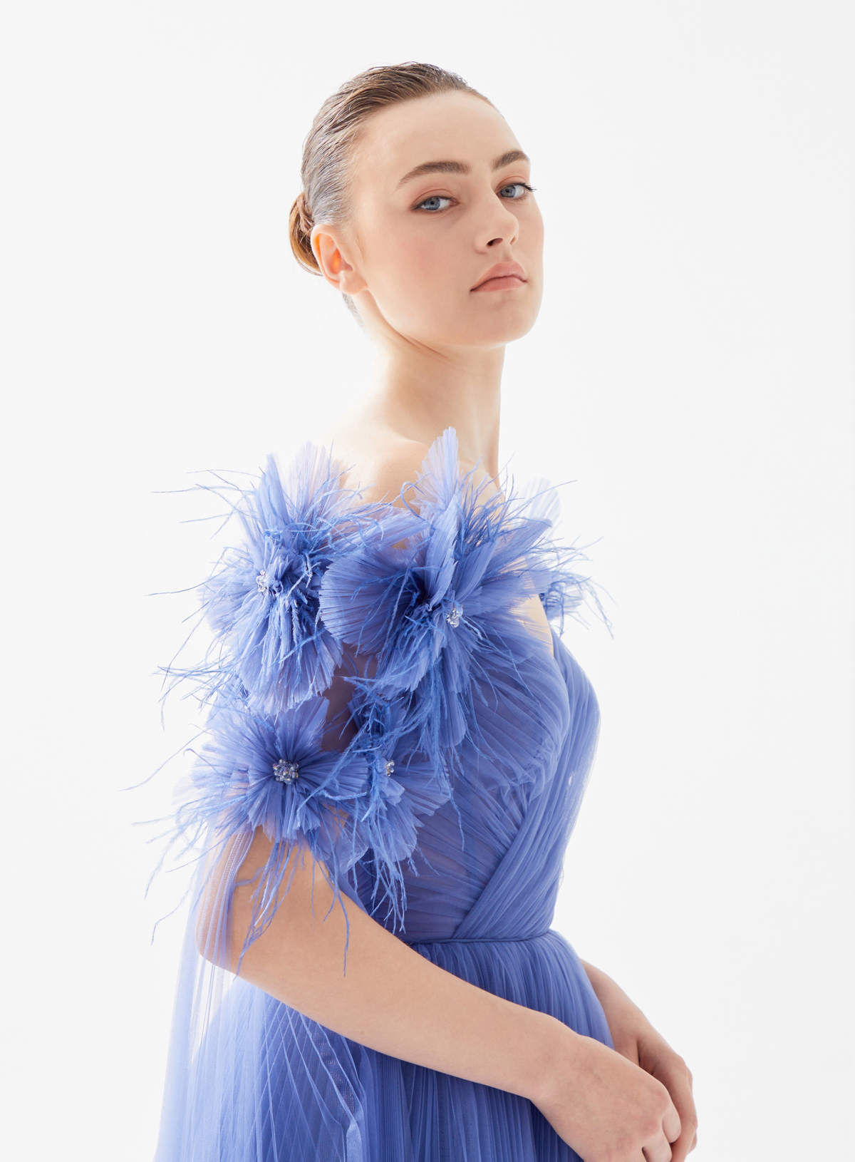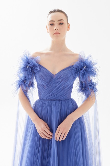 فستان طويل من التول مزين بالريش مكشوف الأكتاف يعرض بشكل حصري علي تيا دريس من فساتين طارق ايديز 2023