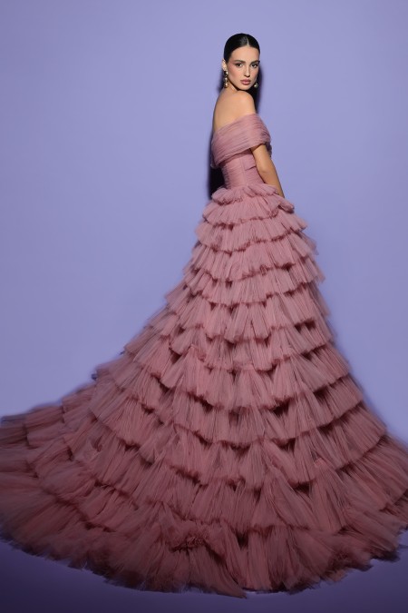 فستان أوف شولدر طويل بتنورة منفوشة من تصميم طارق ايديز الرائع المتوفر على تيا دريس.