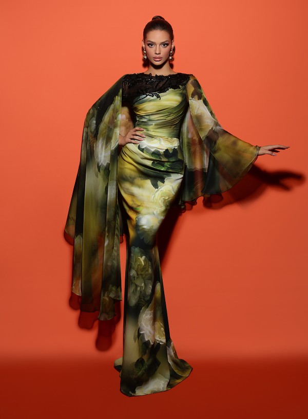 تألقي بلمسة من الأناقة والجاذبية مع فستان بأكمام بقصة مميزة تبرز جمالك للمصمم طارق ايديز متوفرة على تيا دريس.
