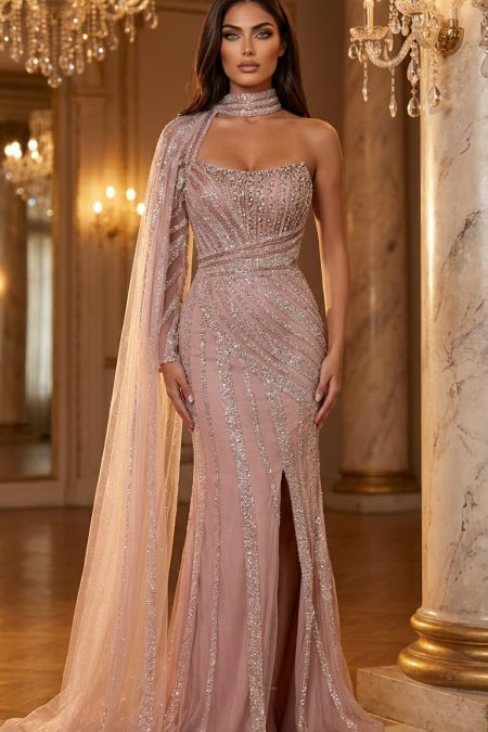 فستان بكم واحد وشال مشغول بالكامل