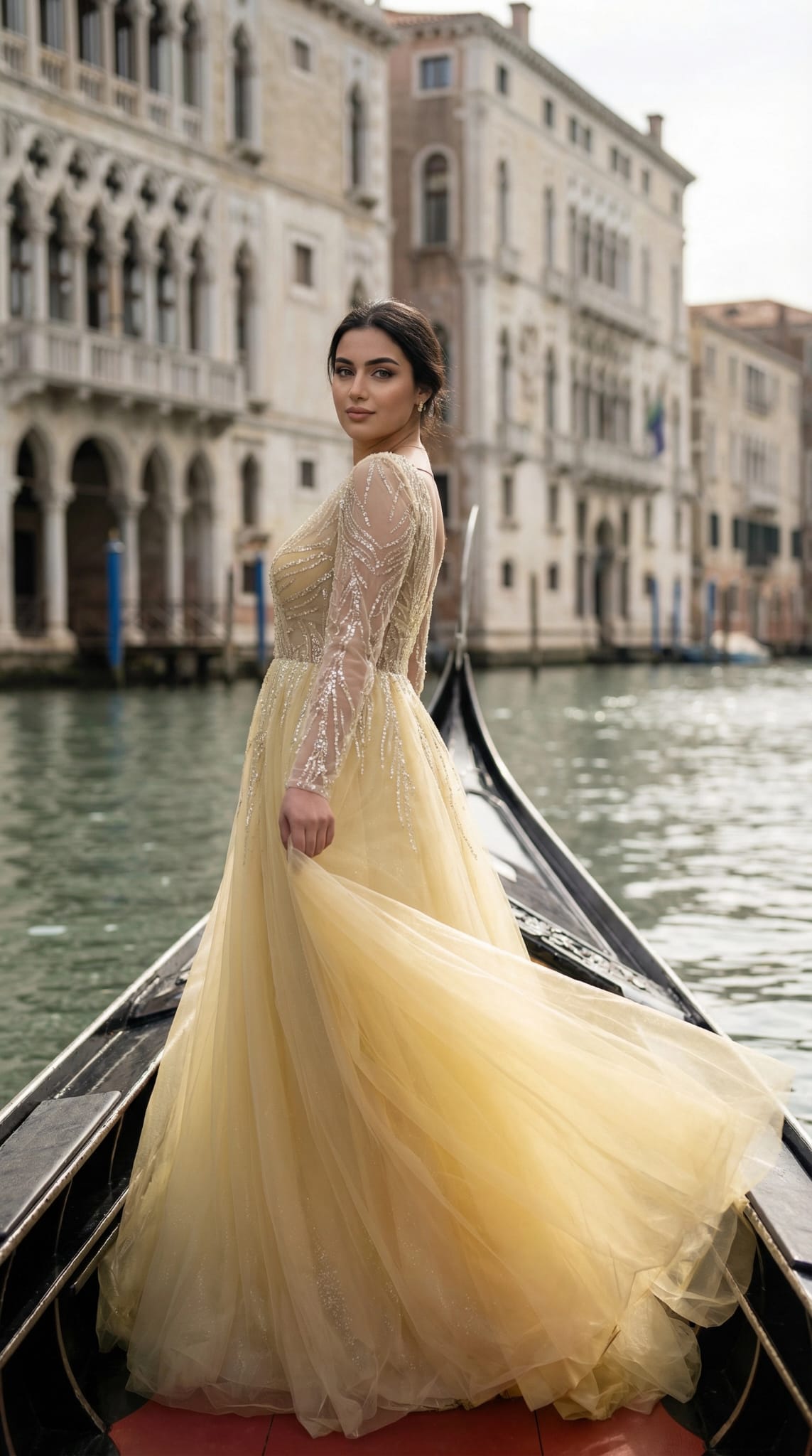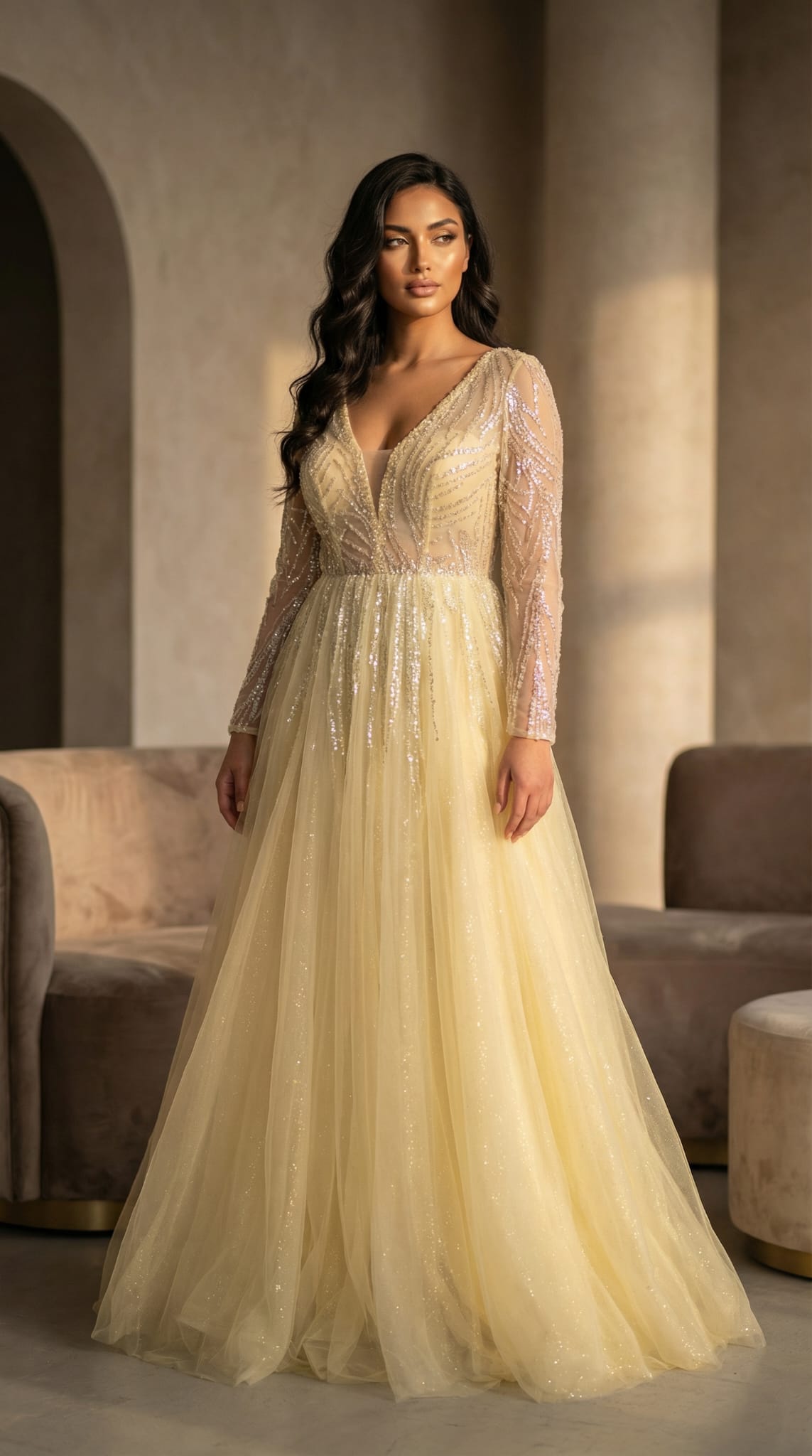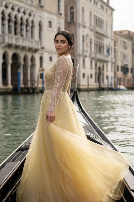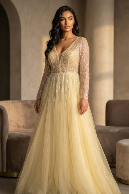 فستان باللون الاصفر الفاتح باكمام طويلة فتحة صدر بحرف في مطرز من الاكمام والصدر والضهر كلوش من التول