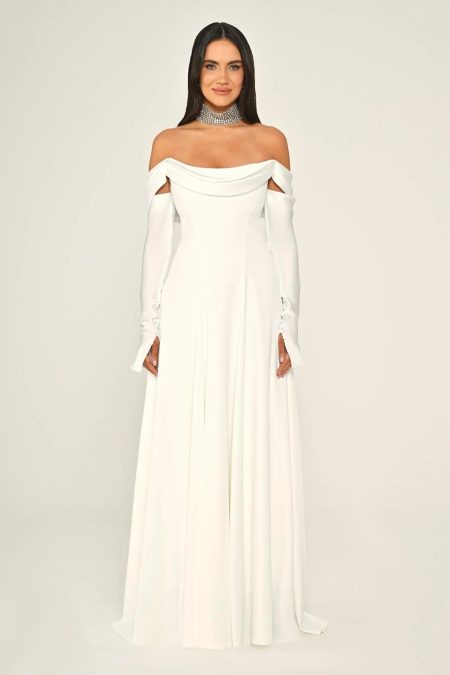 تألقي بفستان طويل من الكريب الساتان بأكمام مكشوفة من الكتف ضمن كولكشن ألفا بيتا 2025.