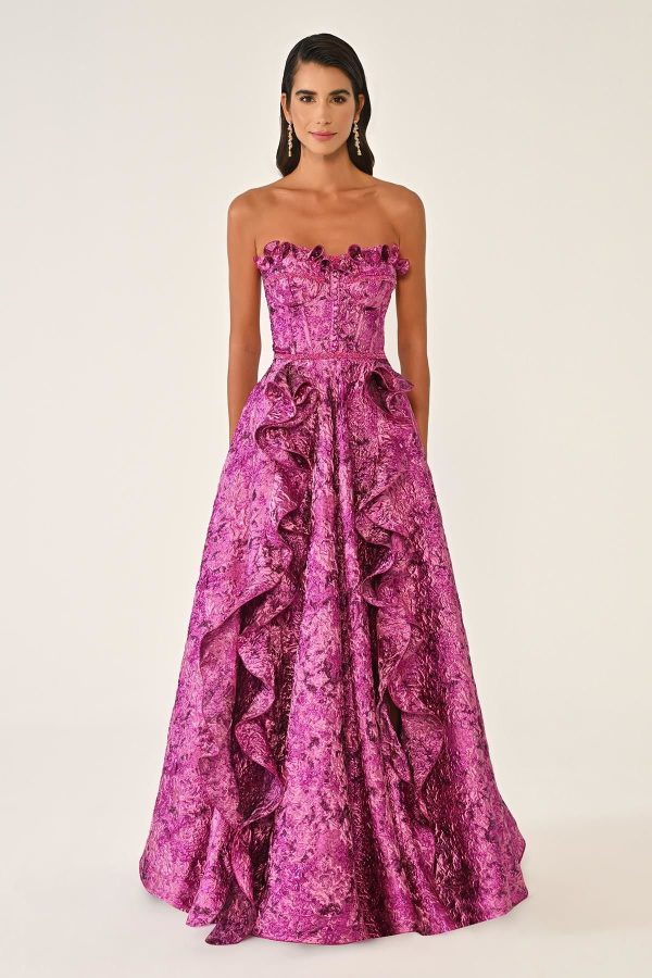 فستان طويل مكشكش بدون حمالات مع فتحات مزدوجة من الأمام من كولكشن ألفا بيتا متوفر بآن على تيا دريس.