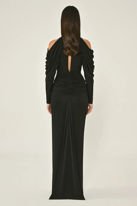 فستان طويل بتصميم كلاسيكي يتميز بقصة مميزة وأكمام طويلة متوفر الآن على تيا دريس باللون الأسود.