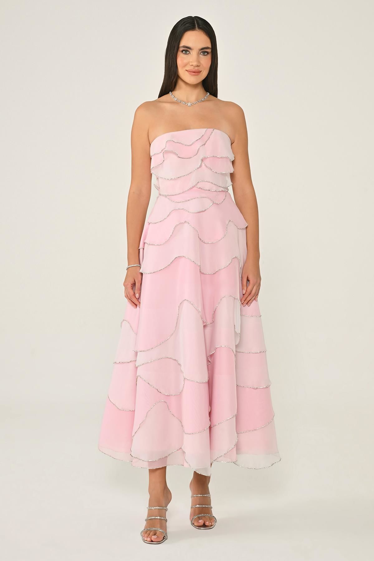 فستان متوسط الطول مكون من طبقات حجرية بدون حمالات متوفر على تيا دريس.