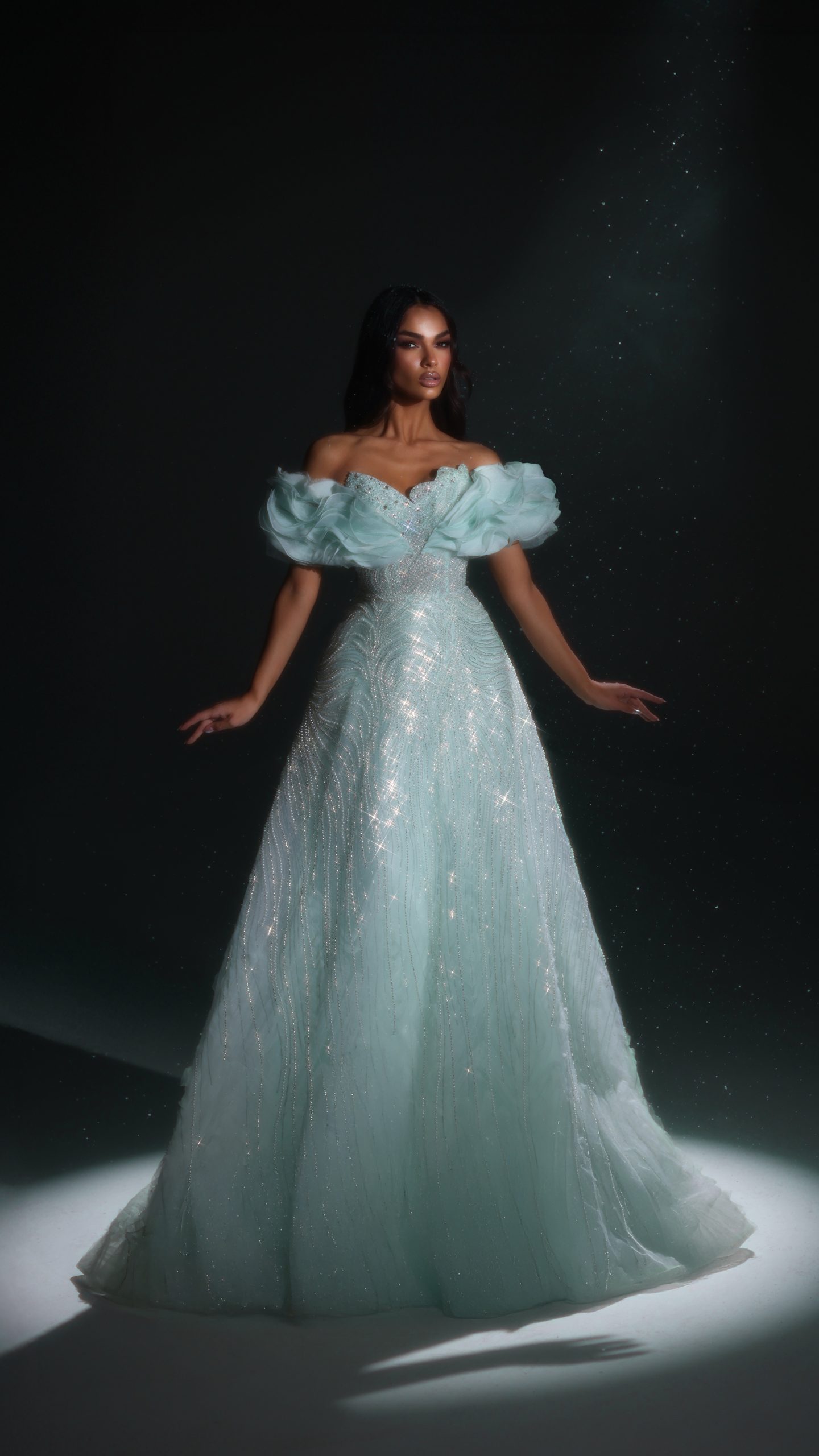 فستان فاخر من مجموع تيا كوتور كلوش بقصة صدر مفتوحة مشغول بشكل كامل