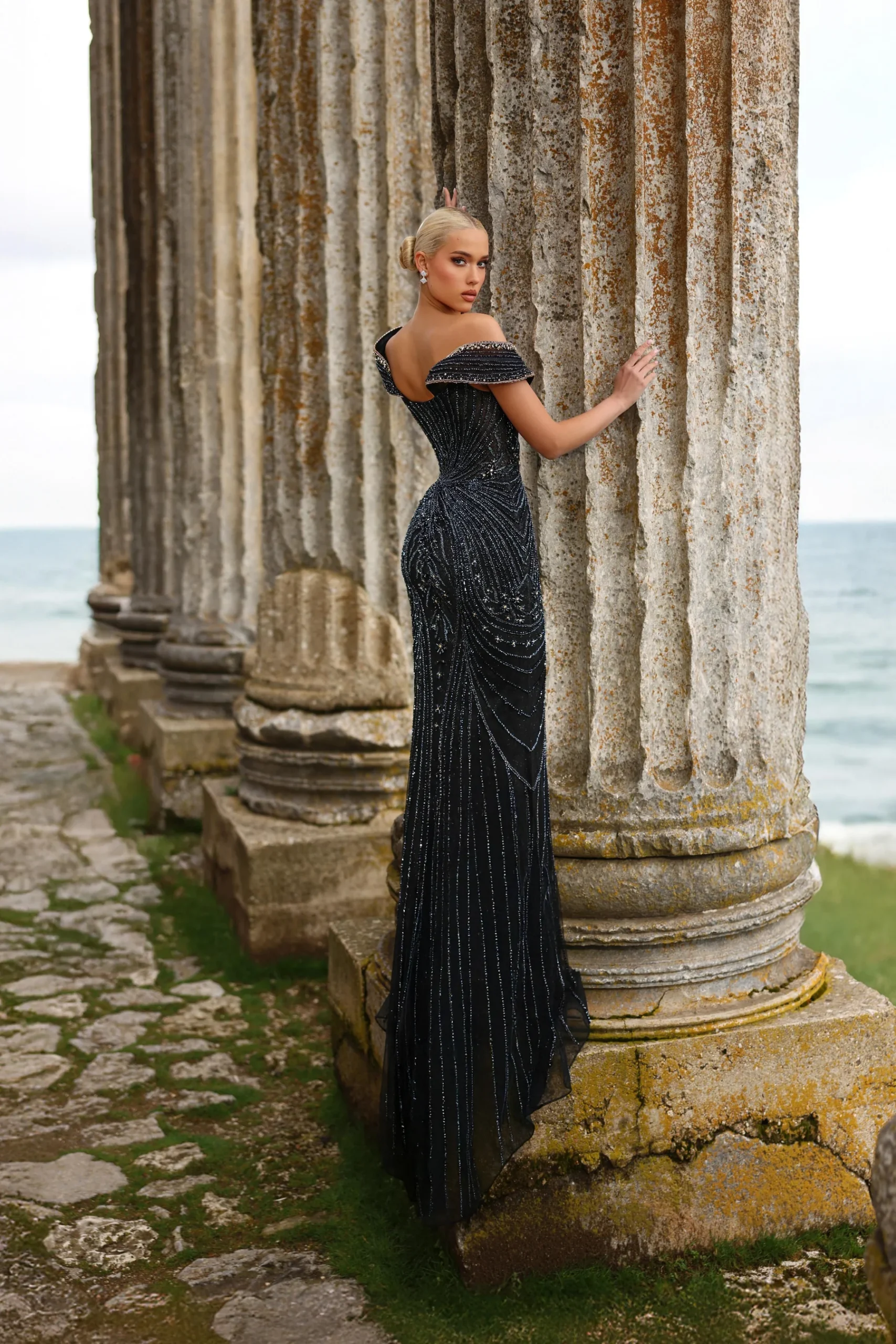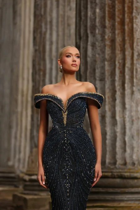 فستان من المجموعة الفاخرة الفي اي بي مشغول بشكل كامل بالاحجار والكرستال بقصة صدر اوف شولدر ياتي بلونين الكحلي والبيج