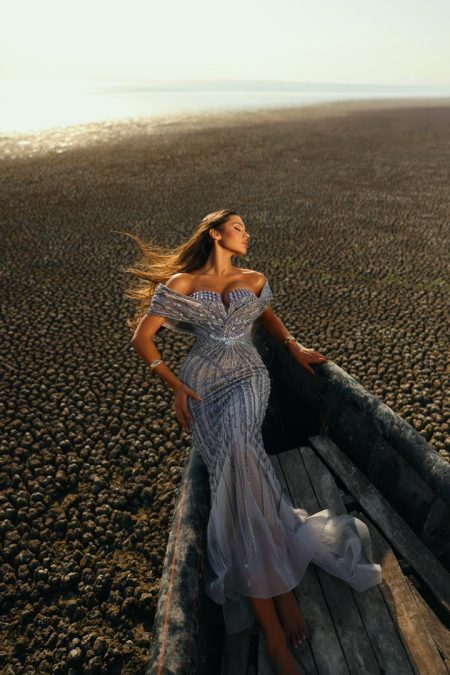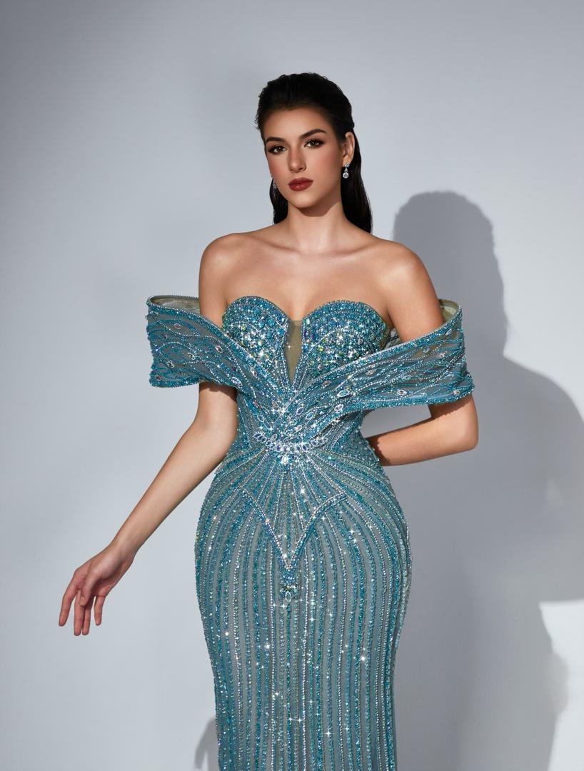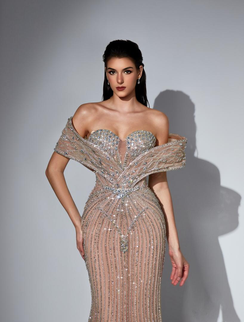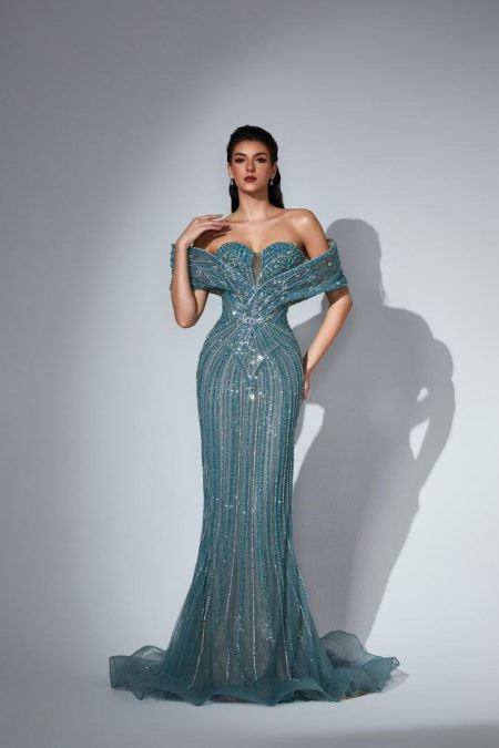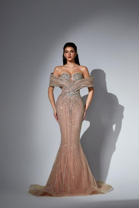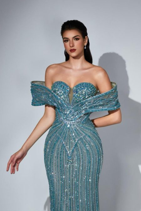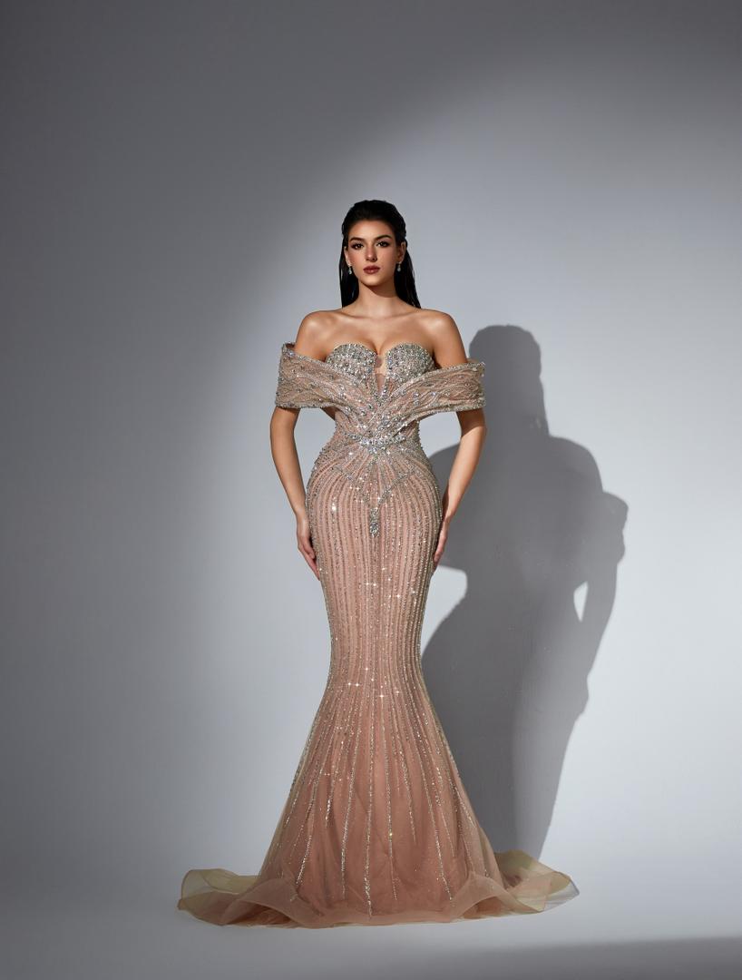 فستان من الفئة الملكية مشغول بشكل كامل بالاحجار والكرستال بقصة صدر توب واكتاف حرة اوف شولدر واسعة
