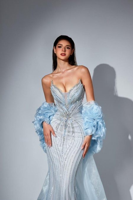 فستان فاخر من كولكشن 2026 يعرض فقط حصريا علي تيا دريس مشغول بشكل كامل بقصة صدر توب وفطعة خلفية