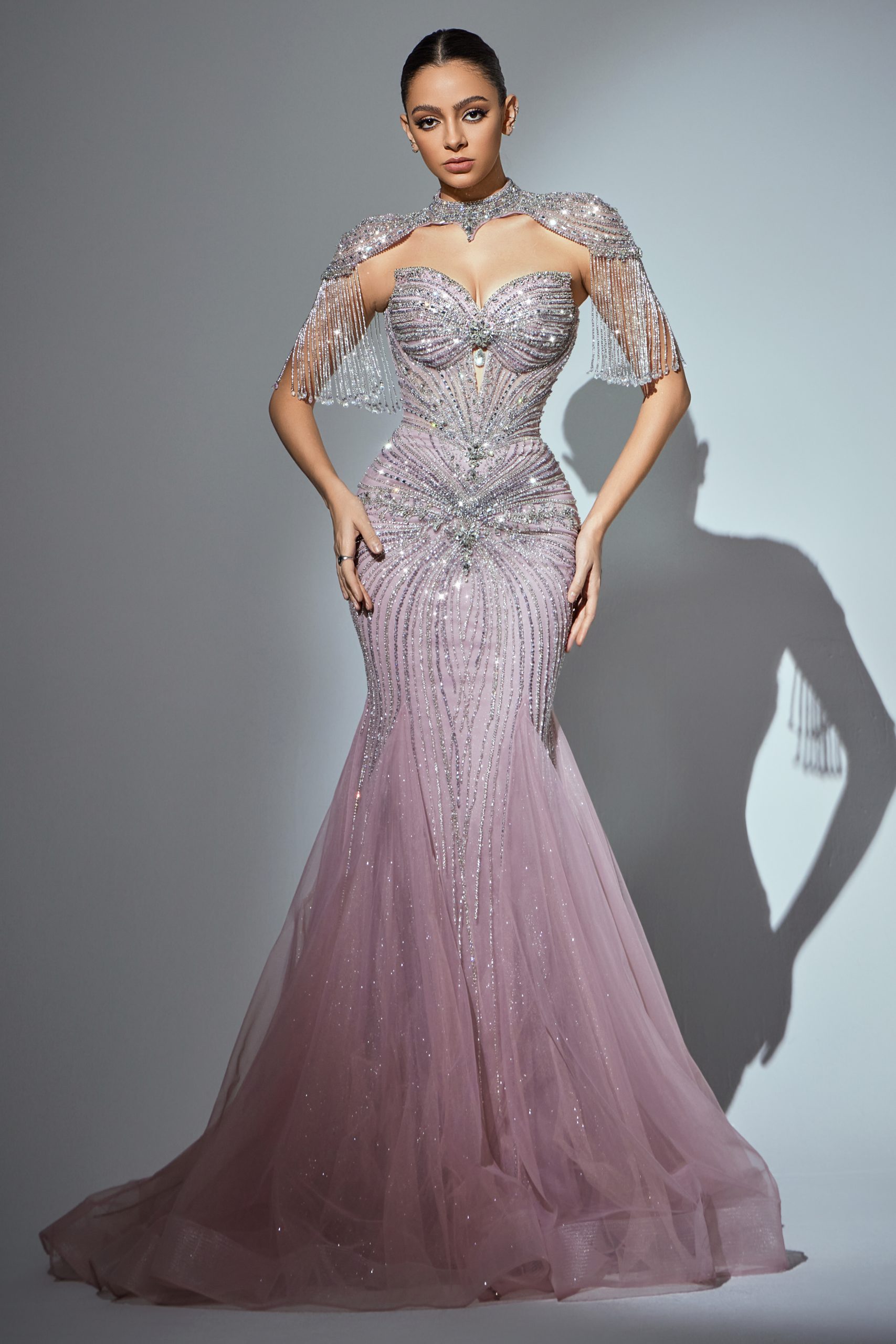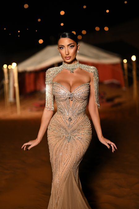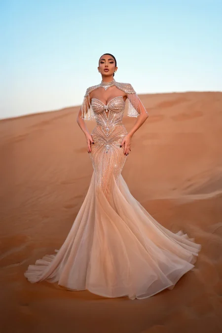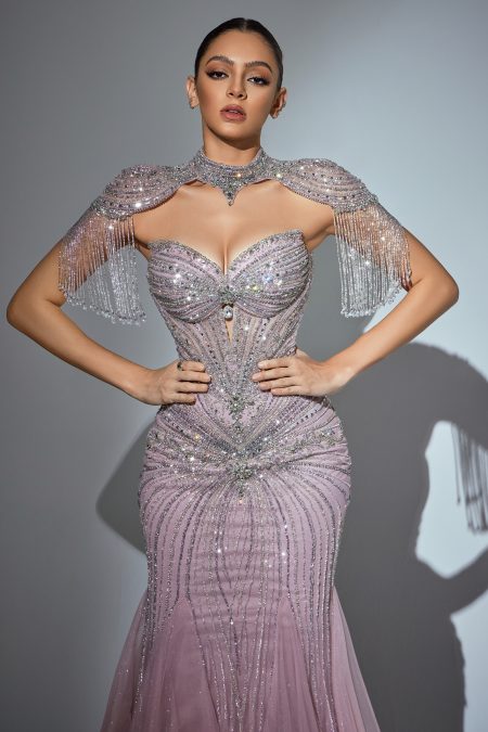 فستان فاخر بطعتين قطعة علوية تغطي الاكتاف وجزء من الصدر من الكولكشن الفاخر مشغول بالكرستال والاحجار