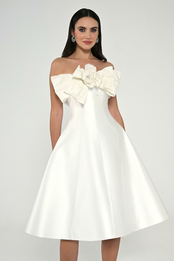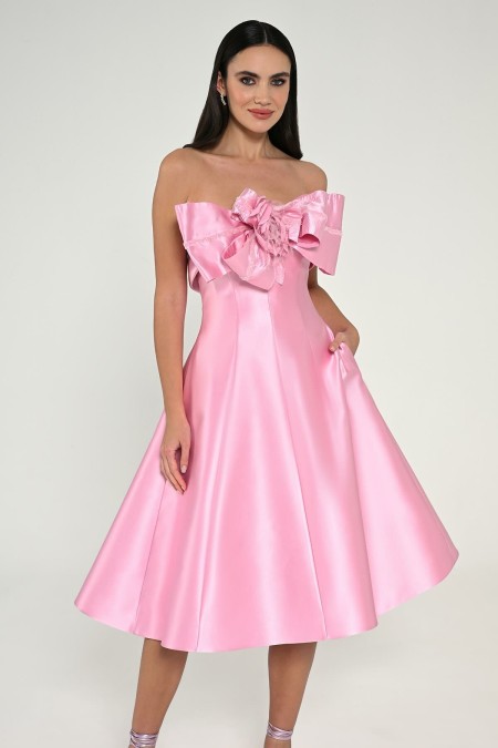 فستان من الستان بفيونكة علي الصدر من الكولكشن الجديد لبراند الفابيتا